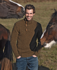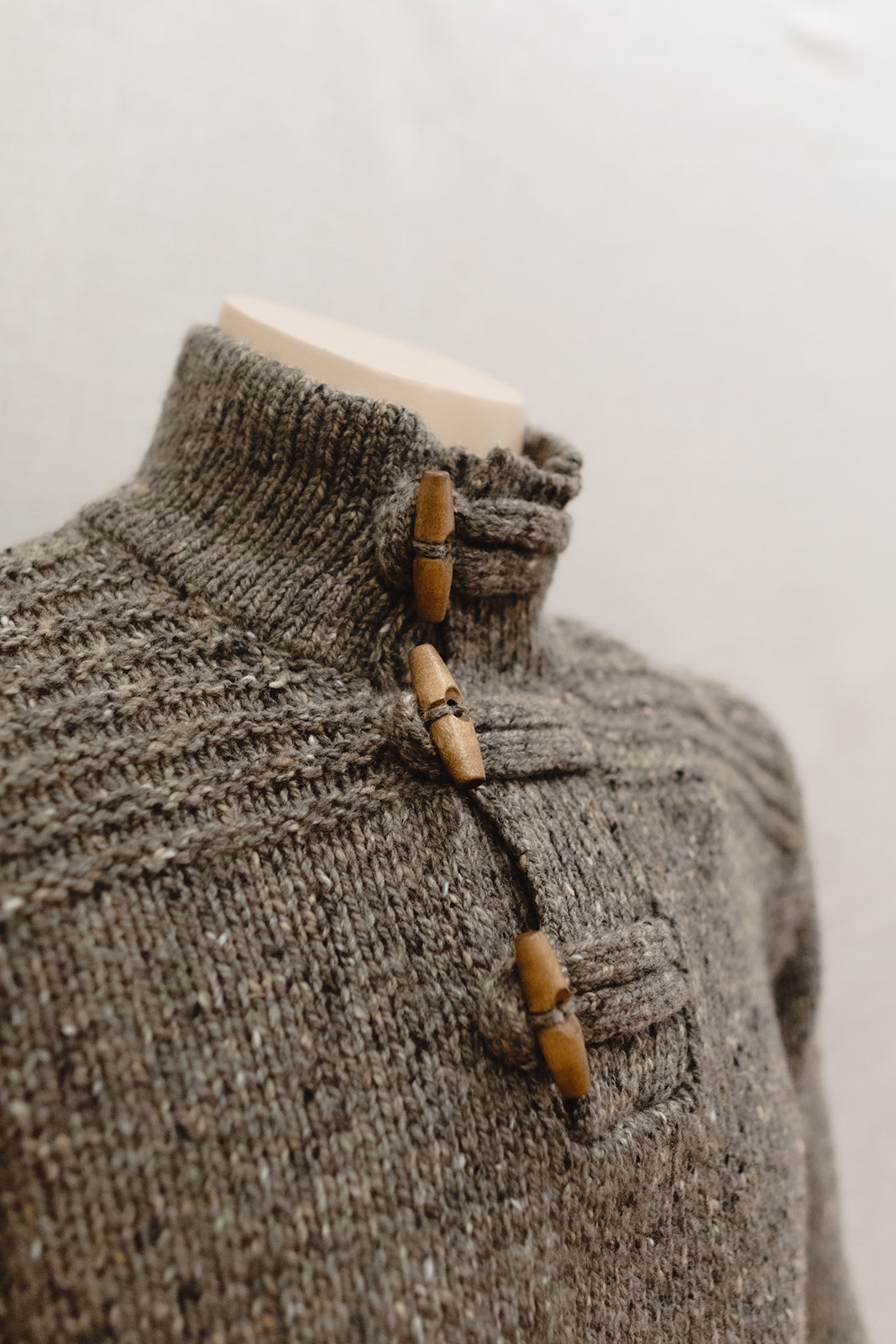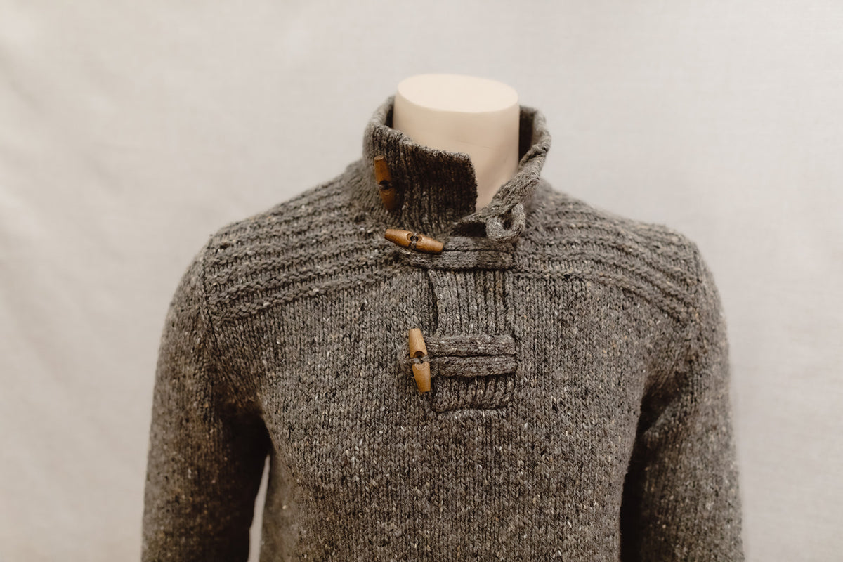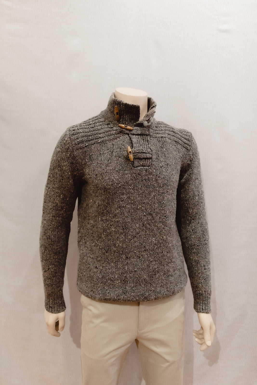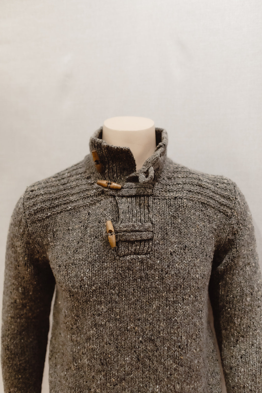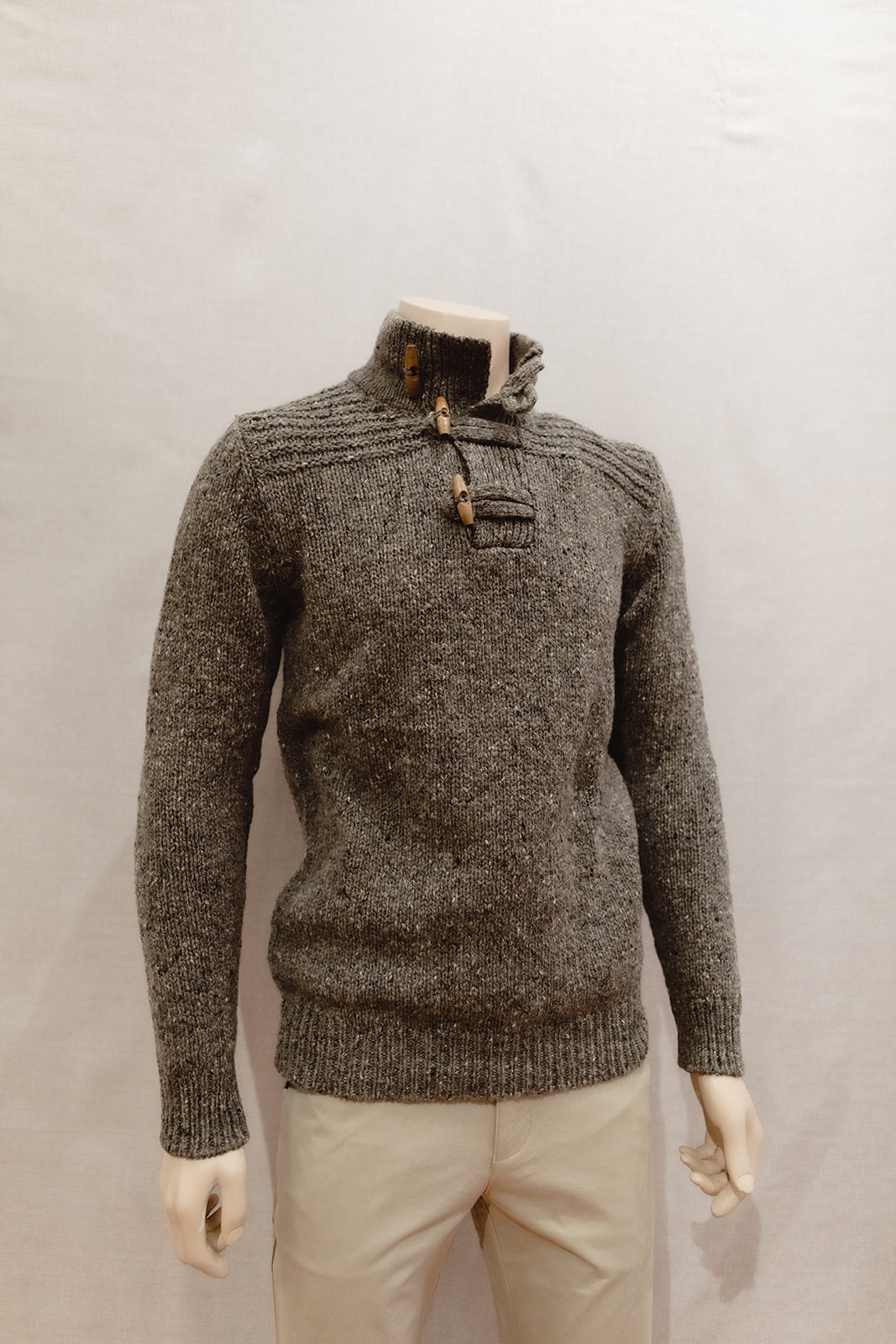 100% Donegal Fleck Mulesing-free Merino Wool, high neck with wooden toggles. Chunky wool with rustic charm. One of our best selling styles. Fit is neat, if you are in between sizes, go for a size up, unless you are after a slimmer fit.