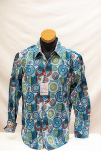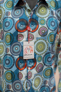 Add a sense of playfulness to your wardrobe with this retro-inspired shirt. Featuring multi-coloured spirals layered over a patchwork of blue to create a truely unique shirt. Featuring our signature contrast trim, peace-sign buttons and John Lennon embroidered motif. Well-tailored and comfortable, this men's shirt features: