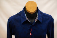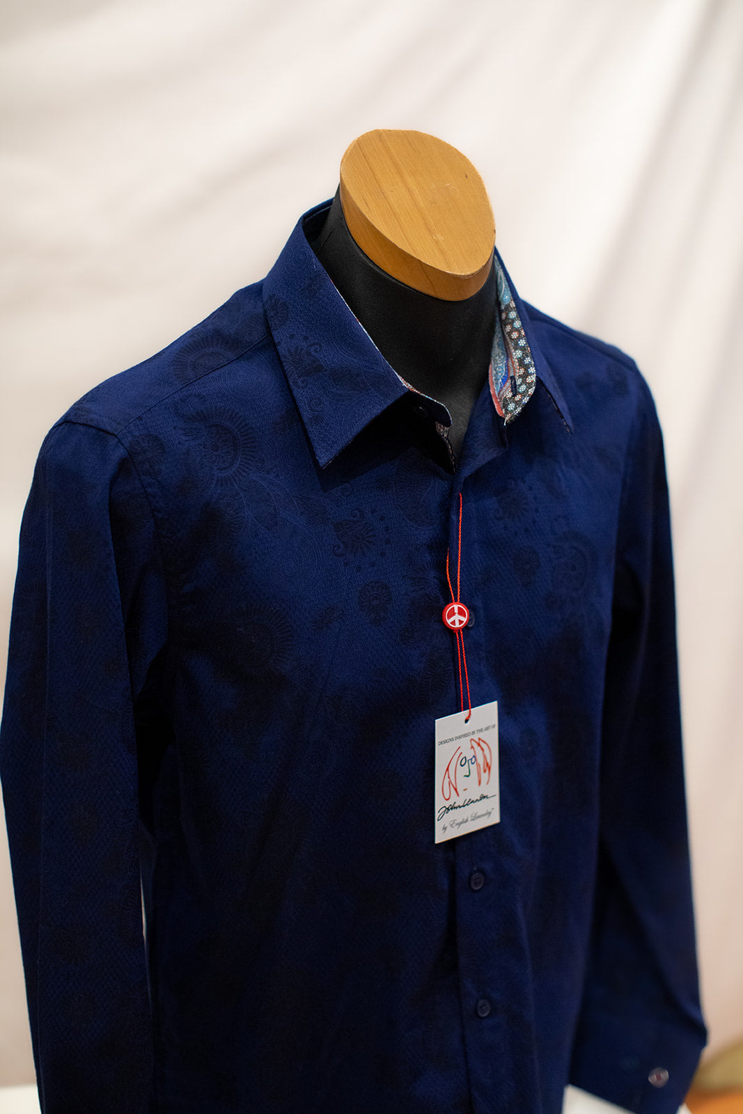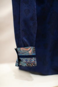 A wardrobe essential that never goes out of style, our sophisticated Navy Wilton shirt with an all-over jacquard paisley pattern and this season's bespoke navy contrast trim. 'What is a jacquard pattern 'you ask. A jacquard pattern is cleverly woven into the fabric, giving it a subtle textural feel.