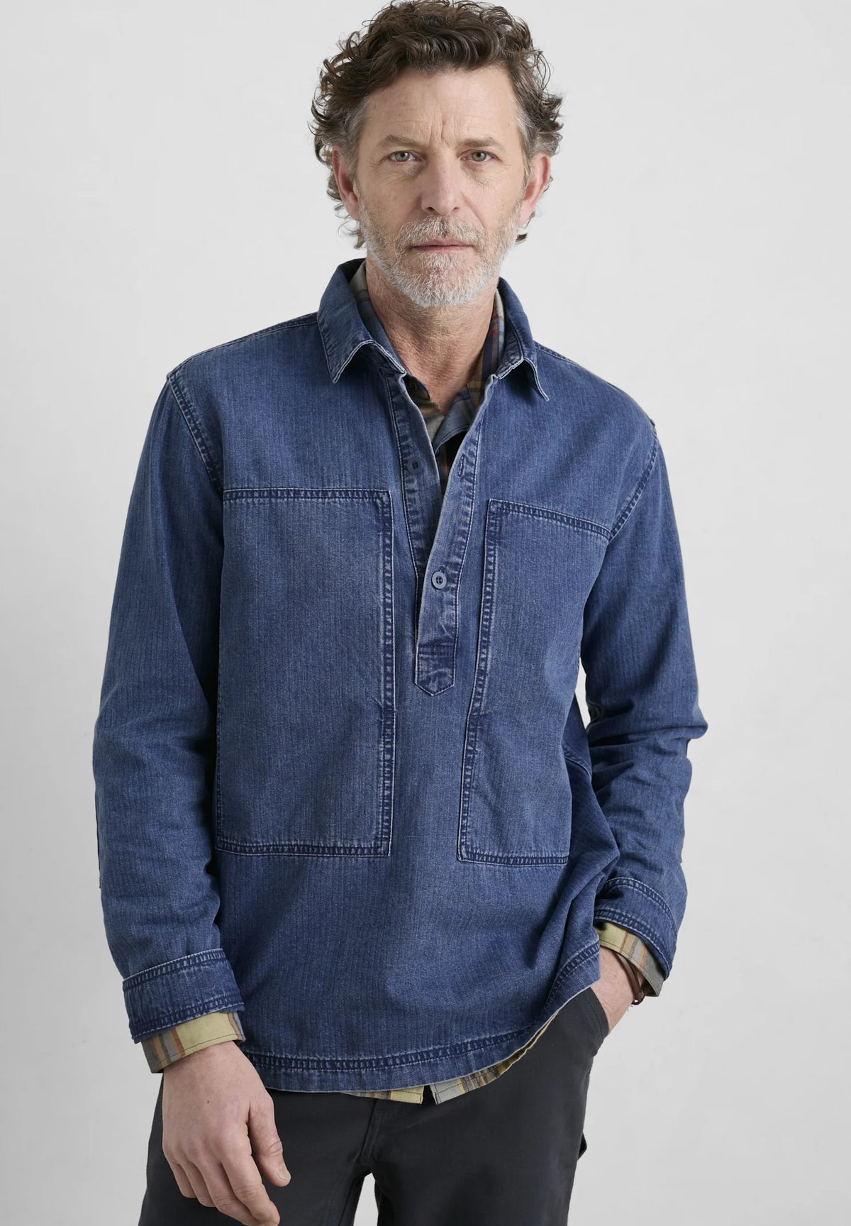 A practical button-up overshirt, inspired by the hardy workwear of Cornish shipwrights and artists. Made from supple organic cotton denim with big patch pockets on the chest, reinforced patched elbows and deep bartack-enforced splits at the hem for easy movement. Twin-stitch detailing and a subtle textured stripe give it an effortless edge.