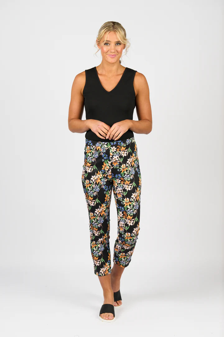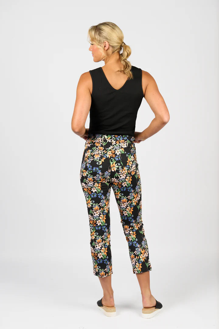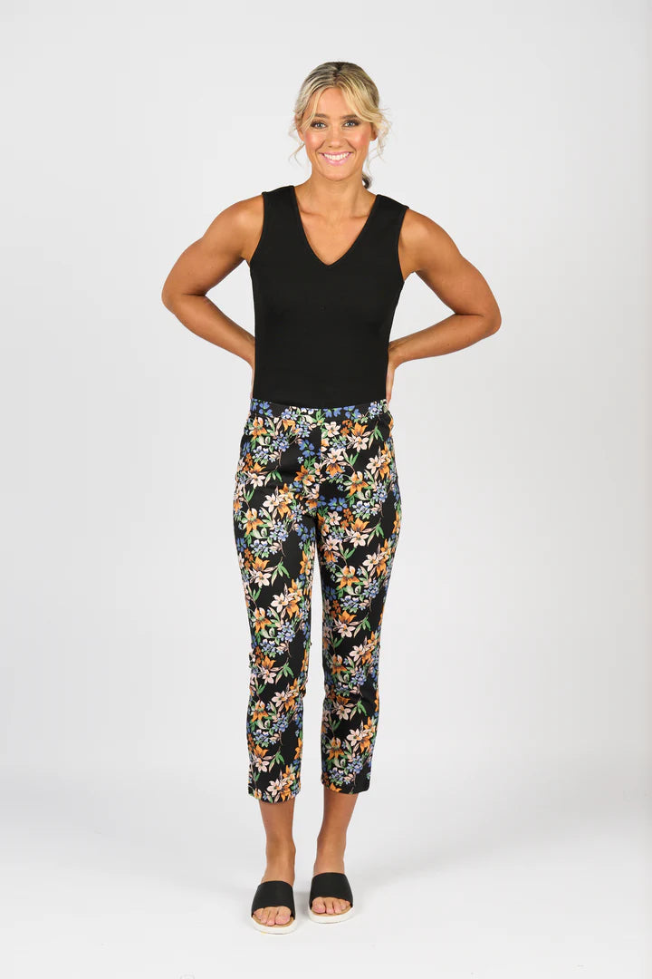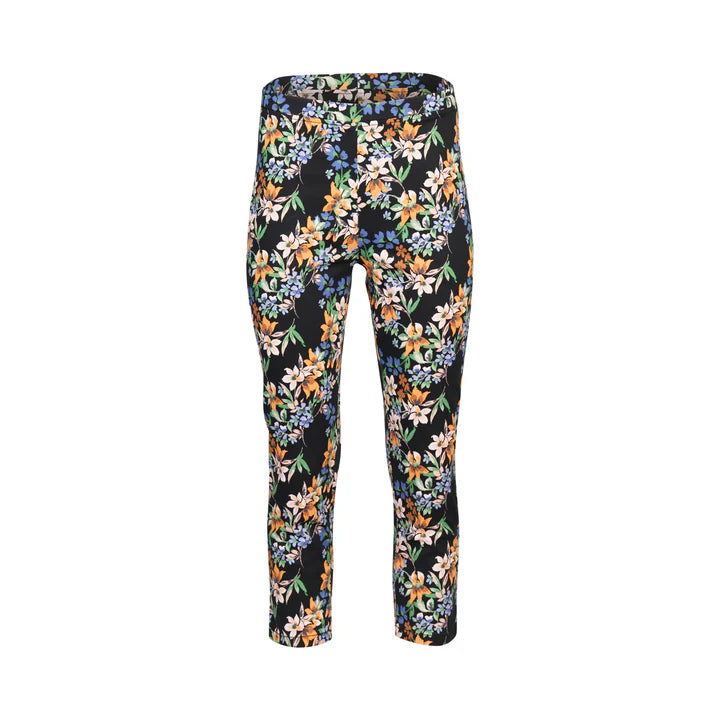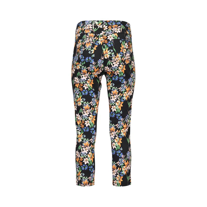 - This printed skinny leg 7/8 length pull-on pant is made from a lightweight cotton-elastane stretch fabric for a comfortable, flexible fit. It features an elastic waistband and back patch pockets, offering ease and style for everyday wear.