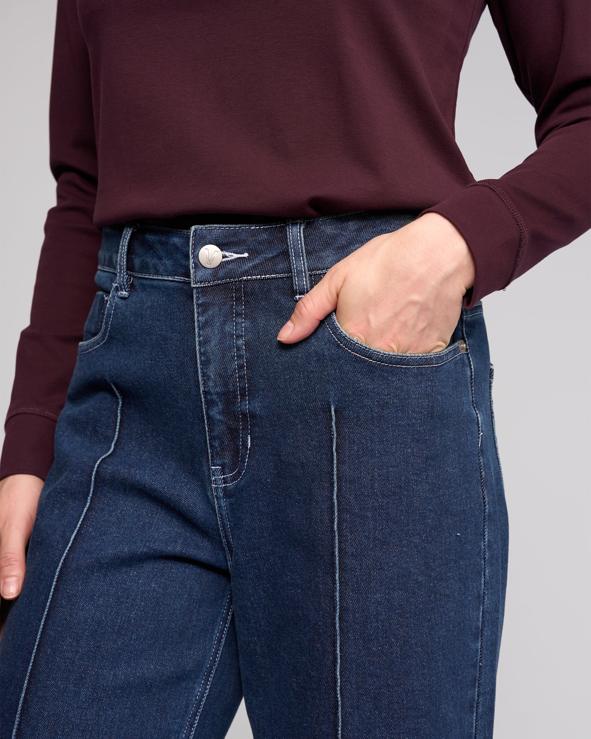 • Waistband features metal 'V' logo jean button closure, two front beltloops, and three back beltloops
