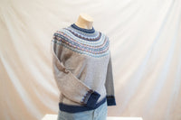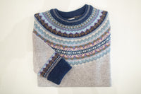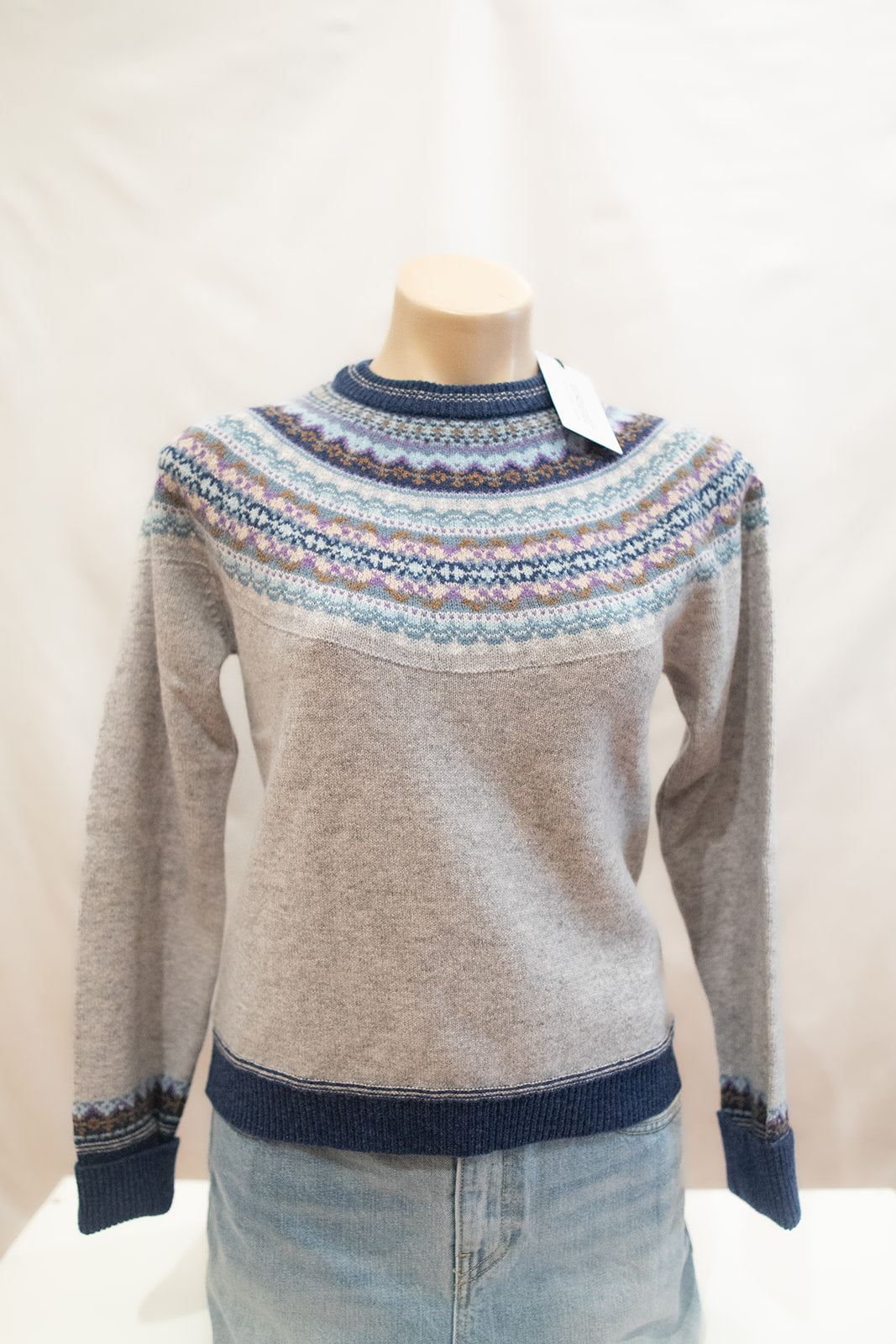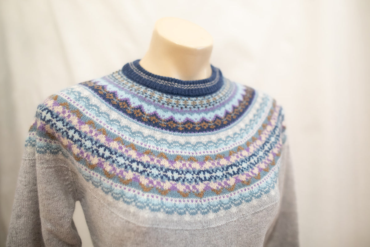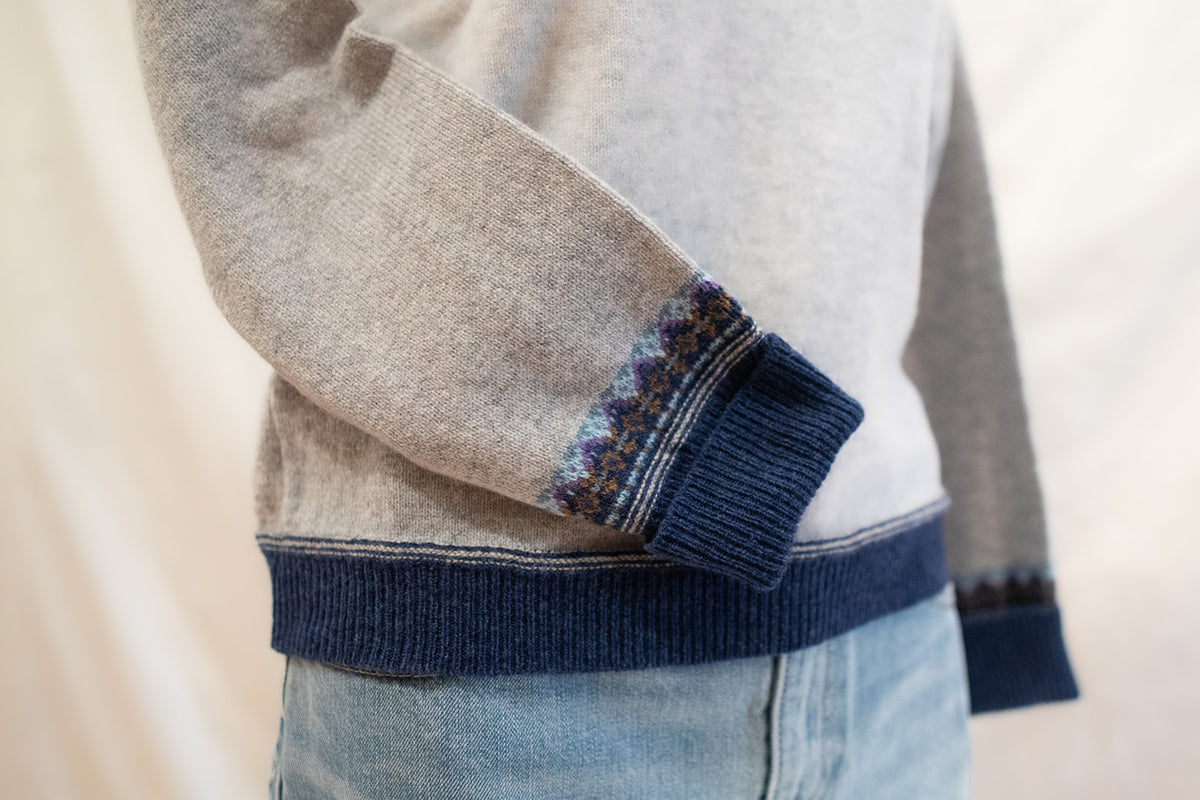 A modern interpretation of the Scottish Fairisle yoke pattern, this design features a subtle rib hem around the hip for a contemporary touch. Above the elongated rib cuffs, small pattern detailing mimics a bracelet, adding a unique flair.