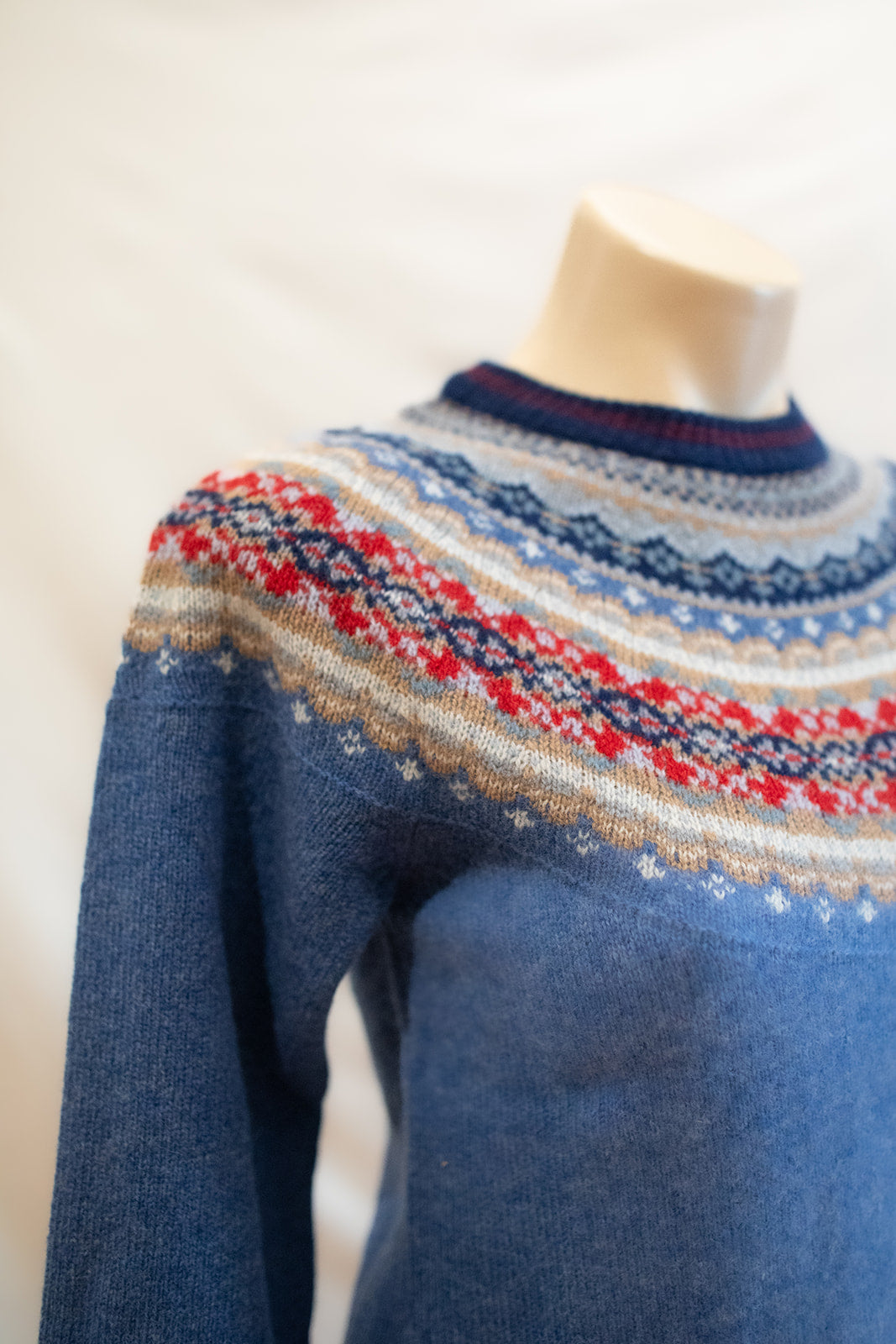A modern interpretation of the Scottish Fairisle yoke pattern, this design features a subtle rib hem around the hip for a contemporary touch. Above the elongated rib cuffs, small pattern detailing mimics a bracelet, adding a unique flair.