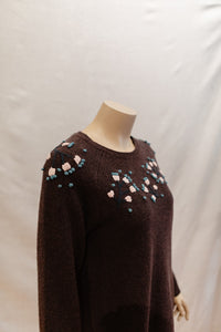 detail : the pullover has a rounded bottom and hand embroidered flowers around the neck hole