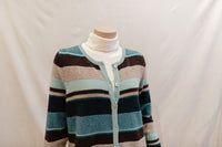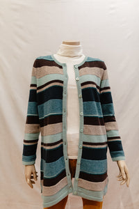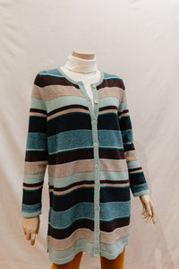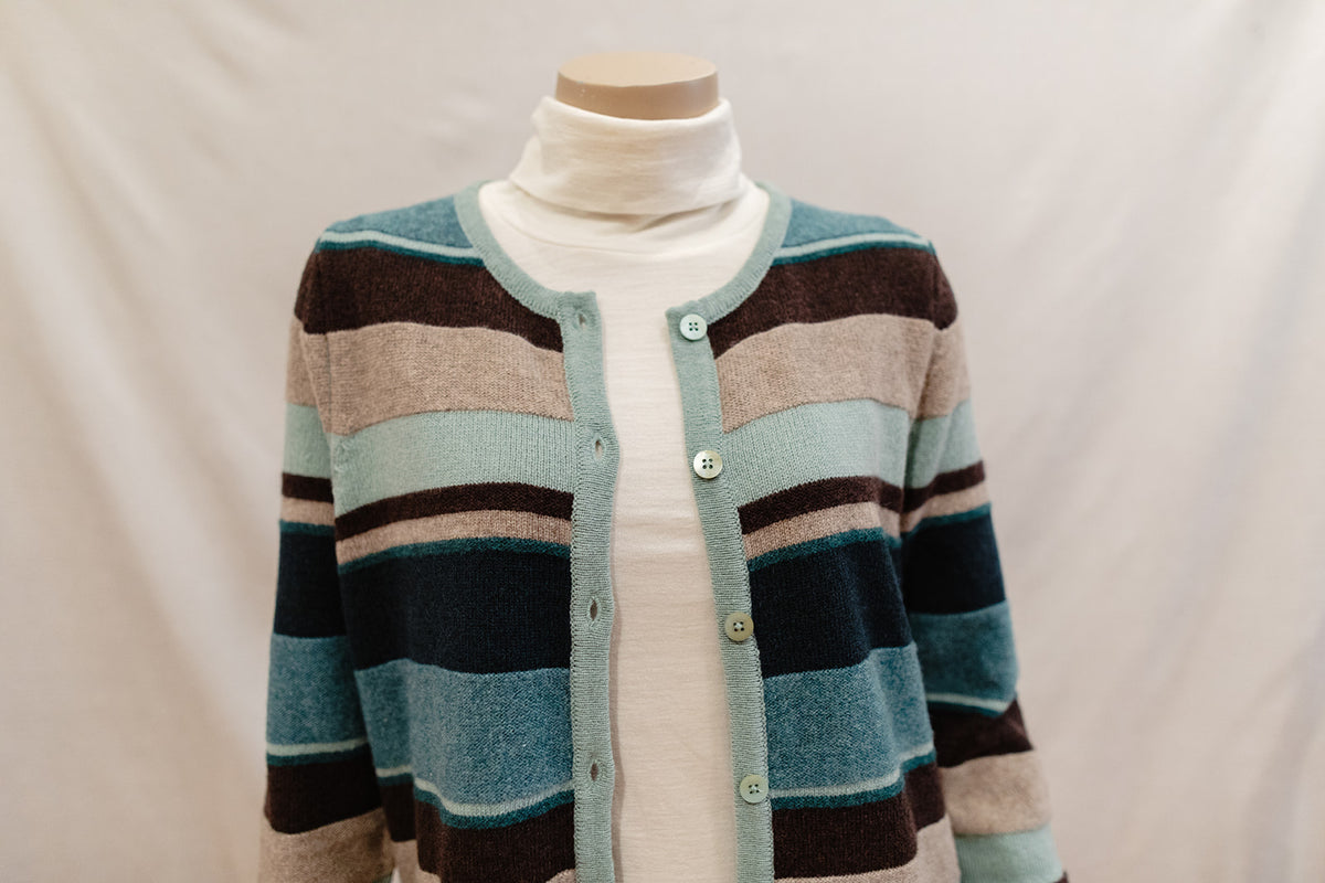 Colourful stripe with plain knit and reverse structure. Cardigan Fabiola has agoya shell buttons