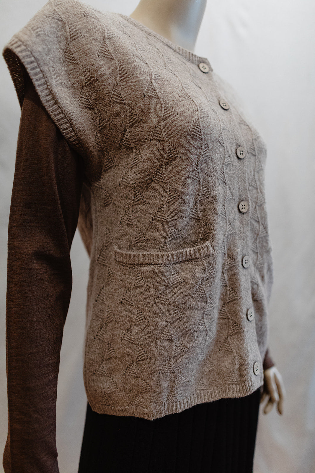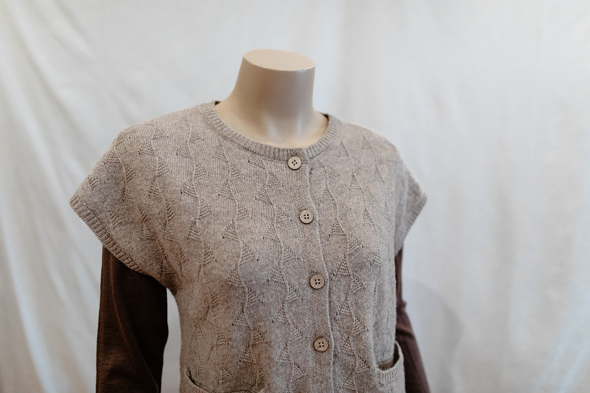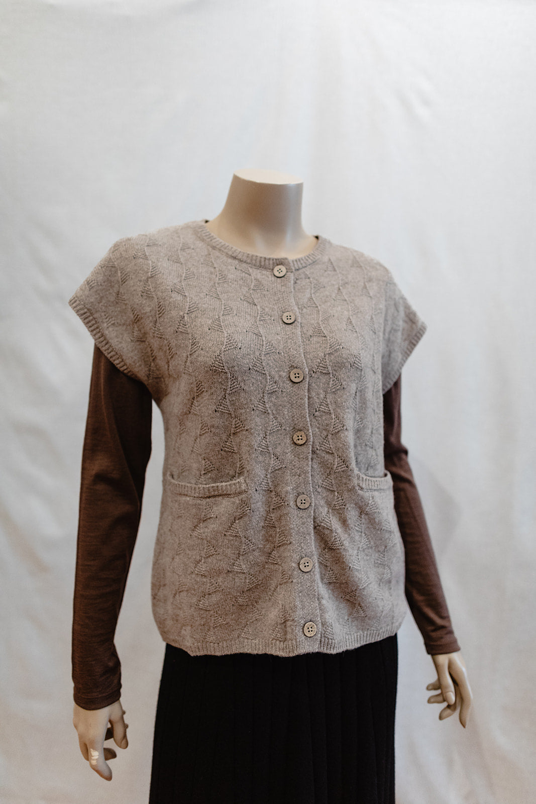 Cap Sleeve Vest in 100% lambswool, Structured knit with a cute pattern and a pocket on either side. Perfect for layering over a merino top, and can be worn open or buttoned up.