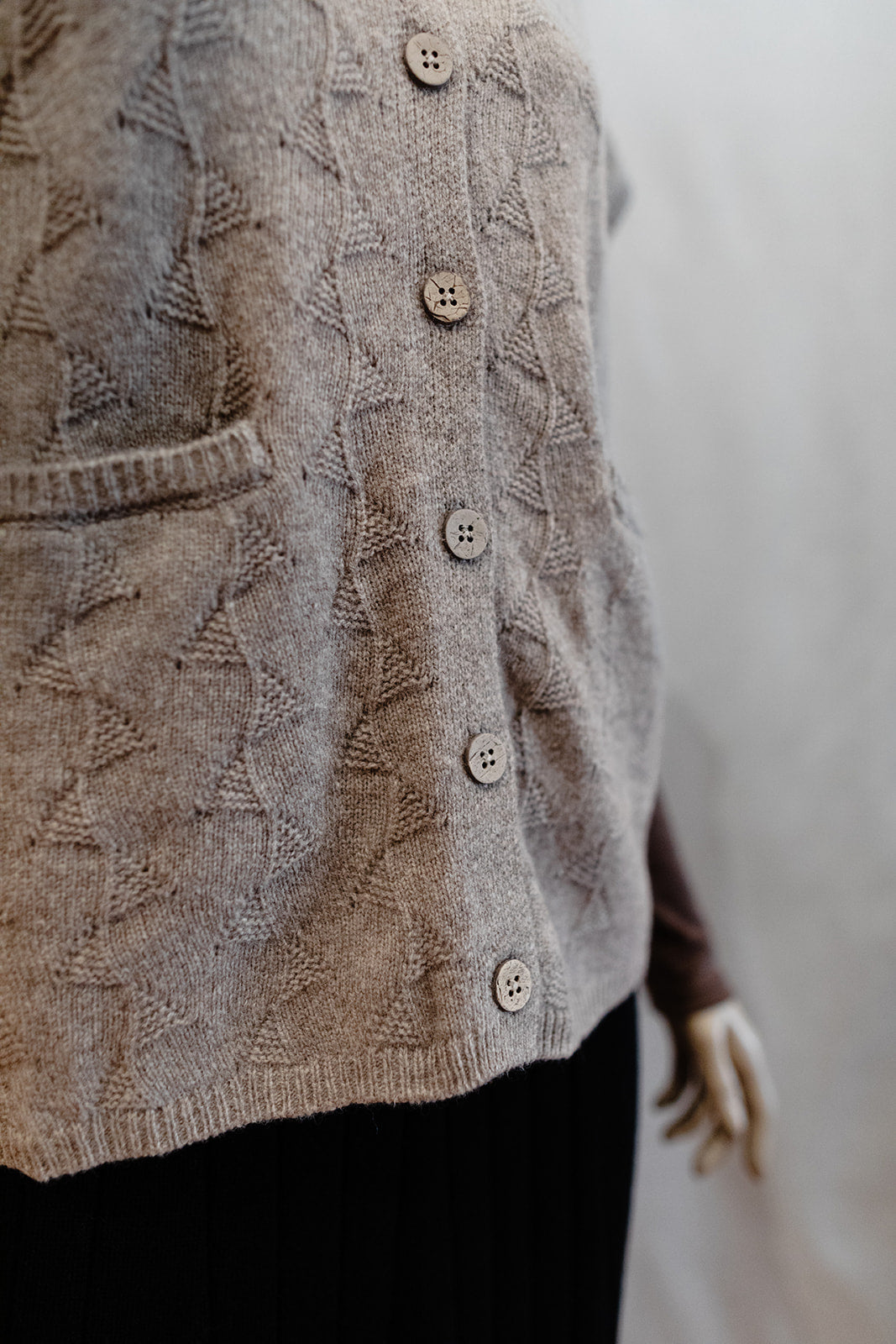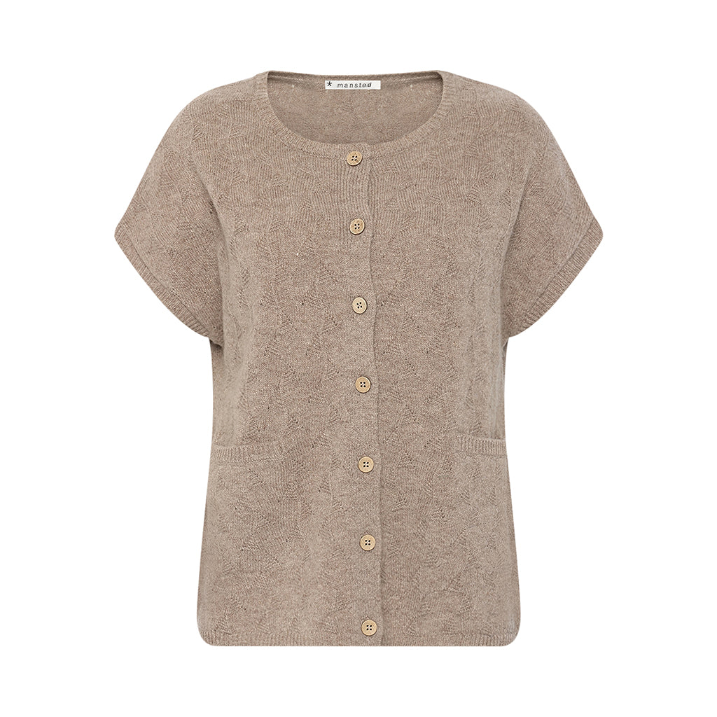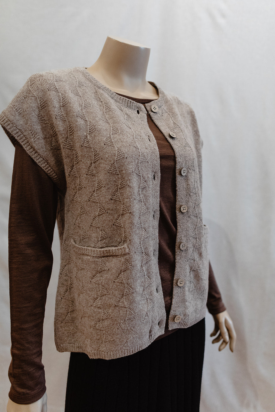 Cap Sleeve Vest in 100% lambswool, Structured knit with a cute pattern and a pocket on either side. Perfect for layering over a merino top, and can be worn open or buttoned up.