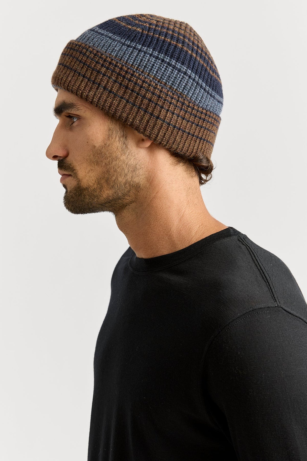 The Gradient Stripe Beanie is a rib knit made of soft Australian Merino Lambswool and features a folded cuff accented by a multi tone graduated stripe.